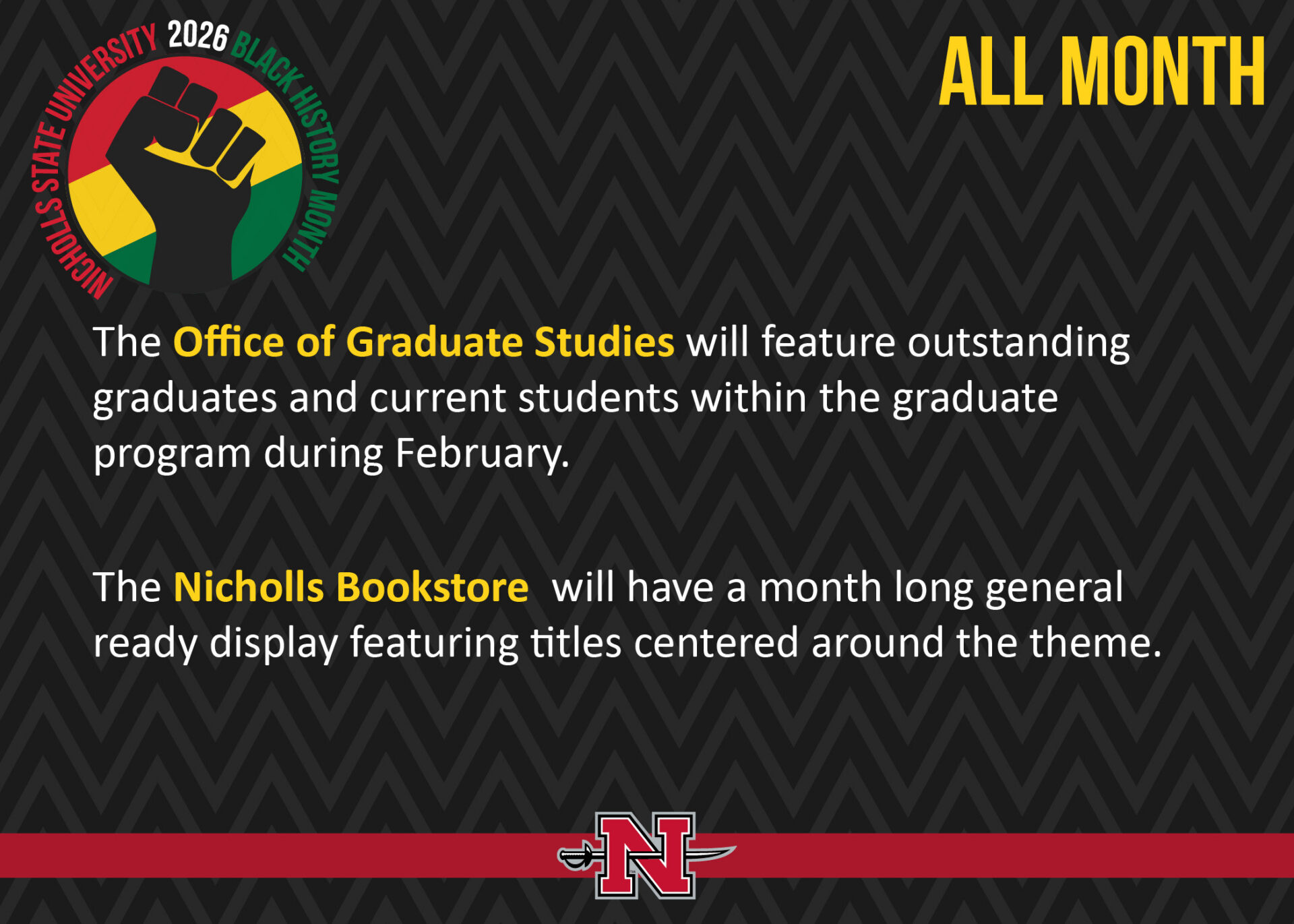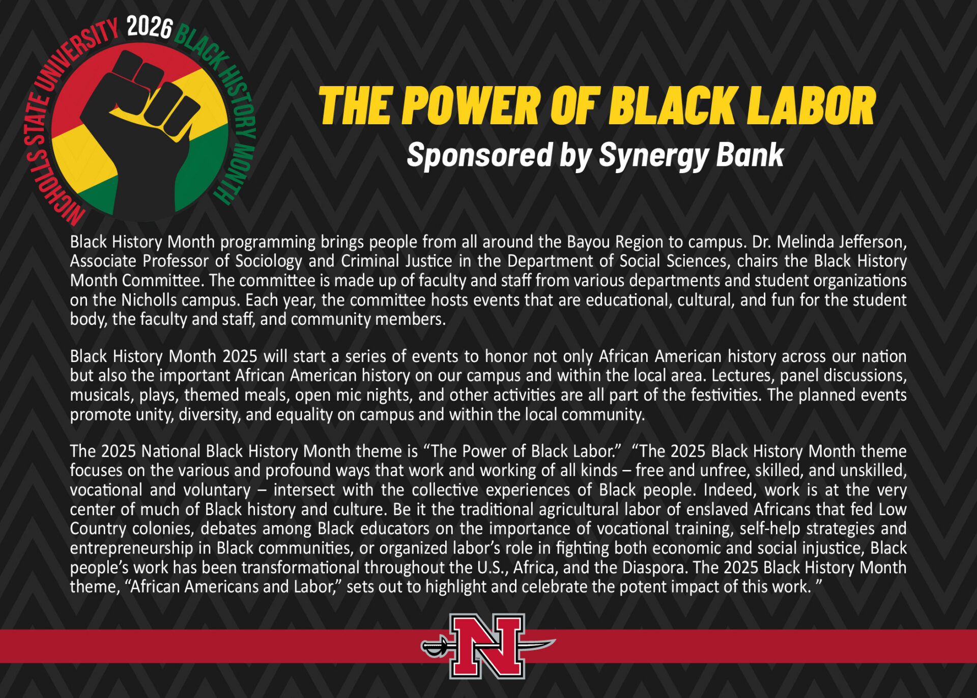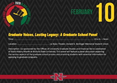 Black History Month programming brings individuals from across the Bayou Region to campus. Dr. Melinda Jefferson, Associate Professor of Sociology and Criminal Justice in the Department of Social Sciences, serves as Chair of the Black History Month Committee, with Elnora Parker Vicks, Counselor and Outreach Coordinator at the Nicholls State University Counseling Center, serving as Co-Chair. The committee is made up of faculty and staff from various departments and student organizations on the Nicholls campus. Each year, the committee hosts events that are educational, cultural, and fun for the student body, the faculty and staff, and community members.