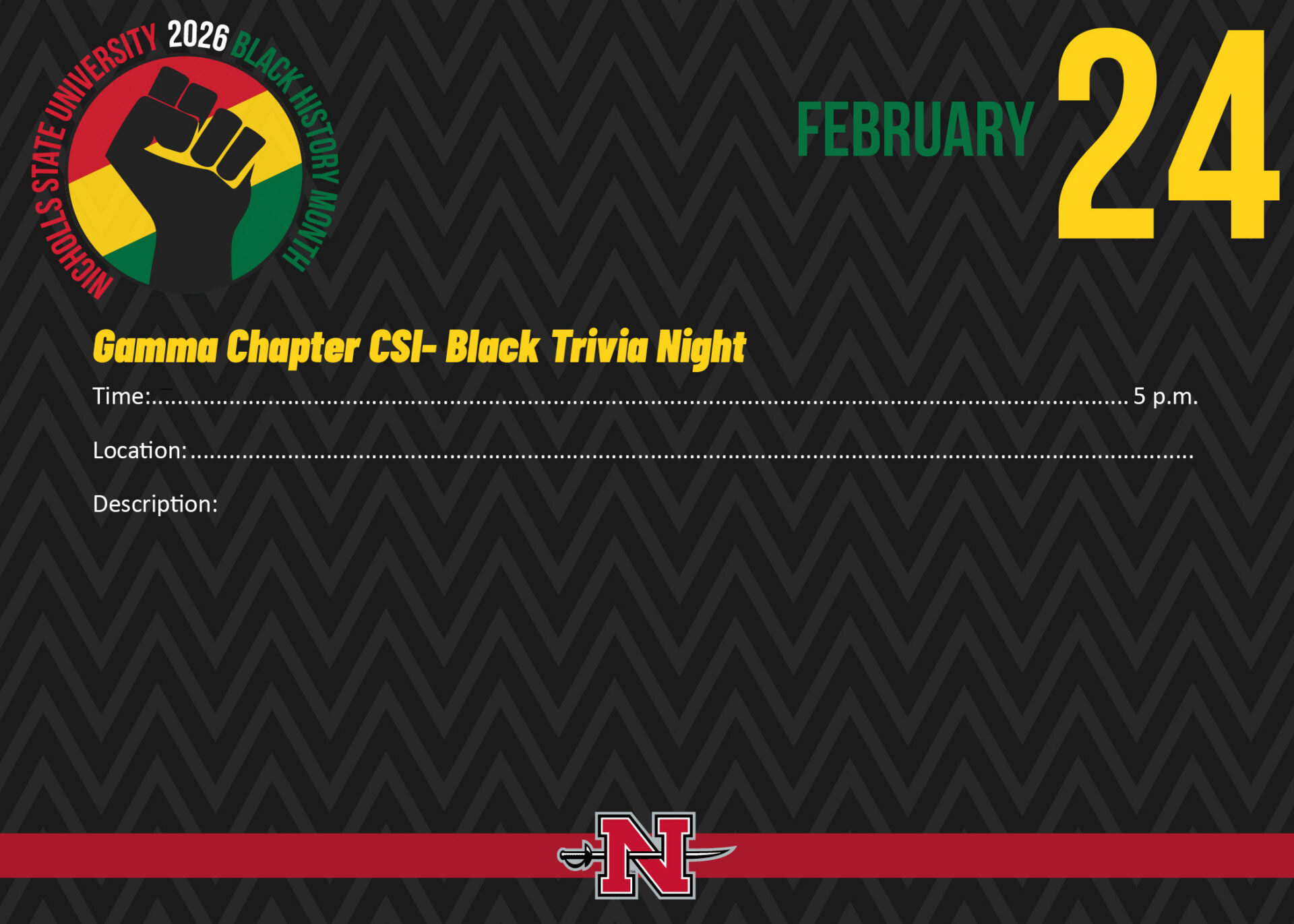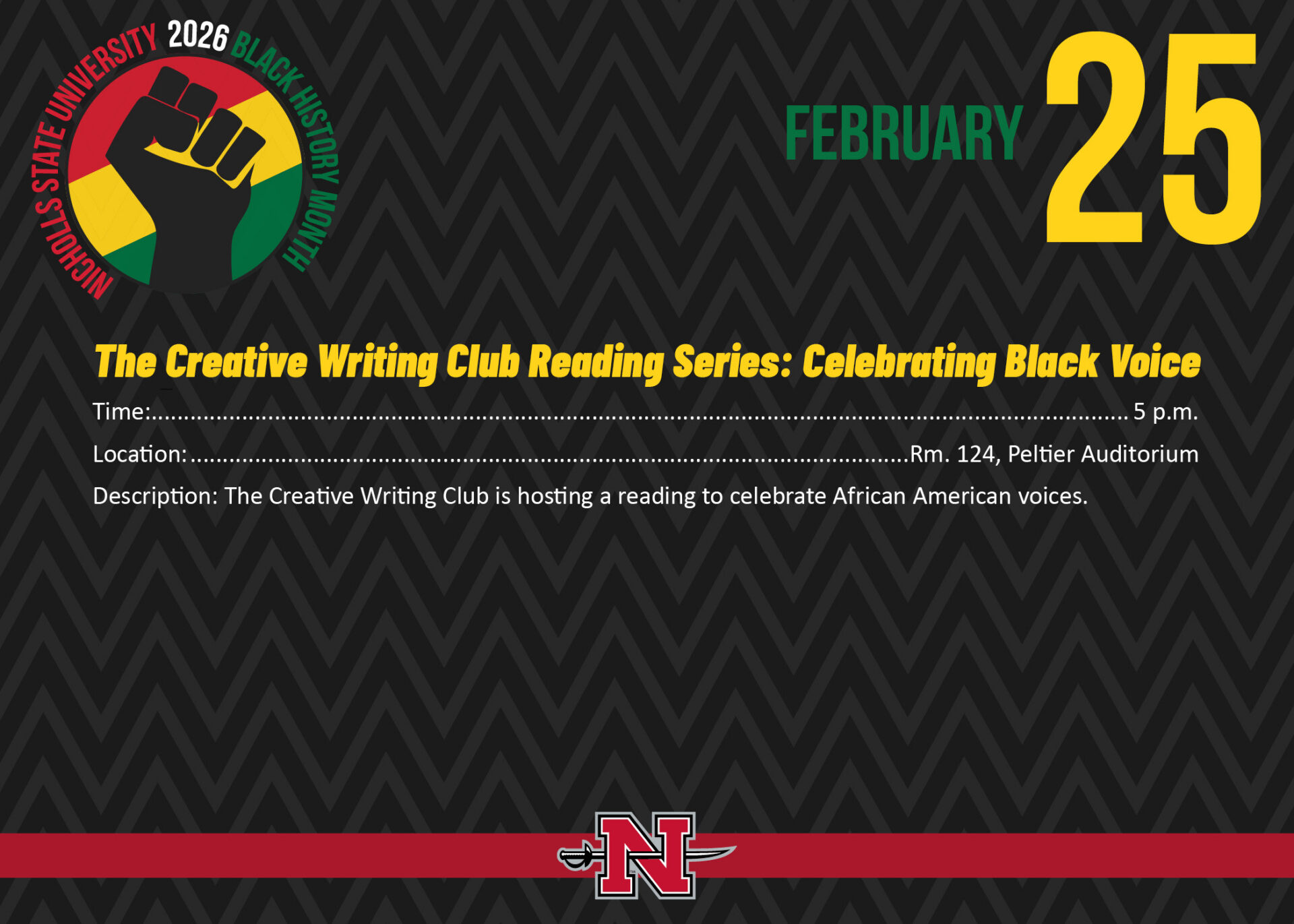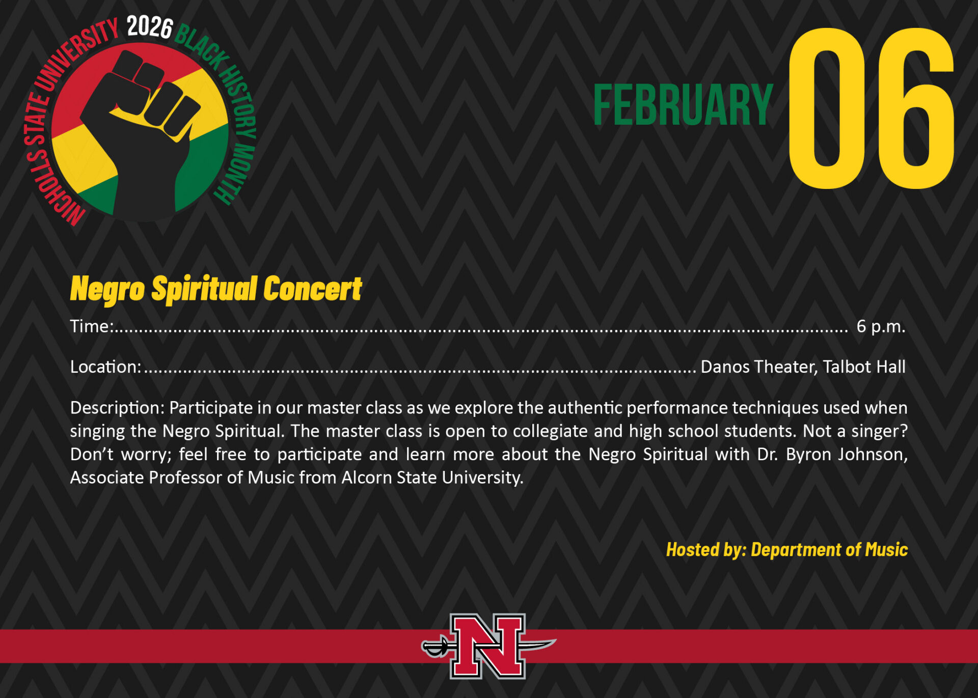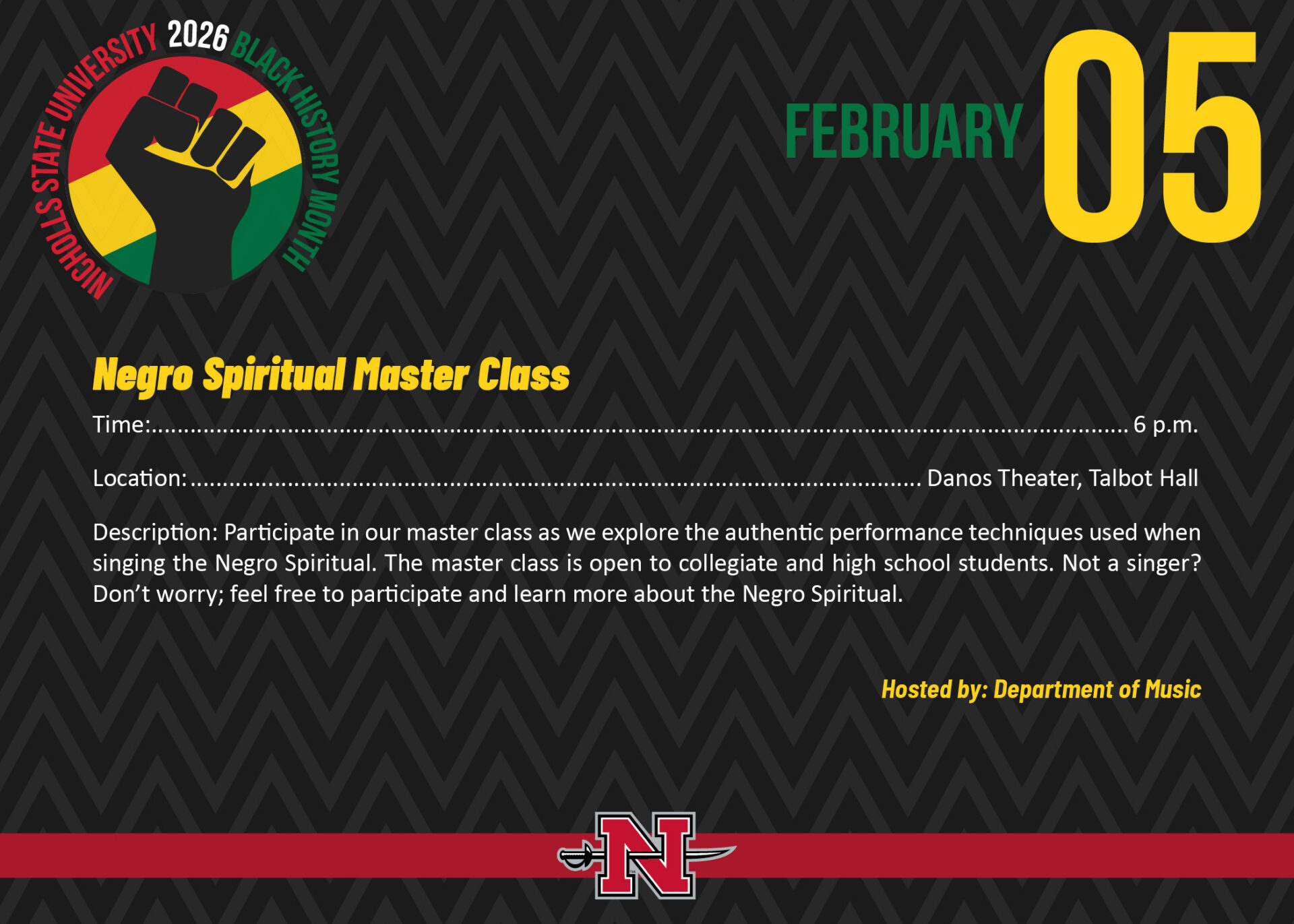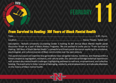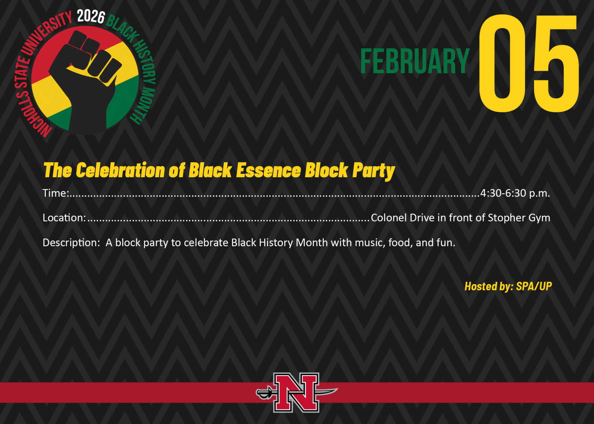 Description: Second Essence of Black Celebration as a part of Nicholls’s Yearly Black History Month events. This historical event will continue to focus on cultivating the dynamics of diversity and celebrating and acknowledging the historical impact of Black Americans on visual arts, music, cultural movements, and more.