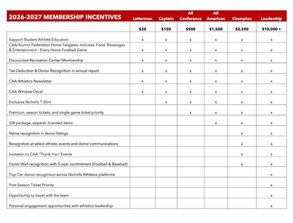 Any individual or organization that gives $35 or more to Nicholls Athletics is included in the Colonel Athletic Association, regardless of how the gift is made.