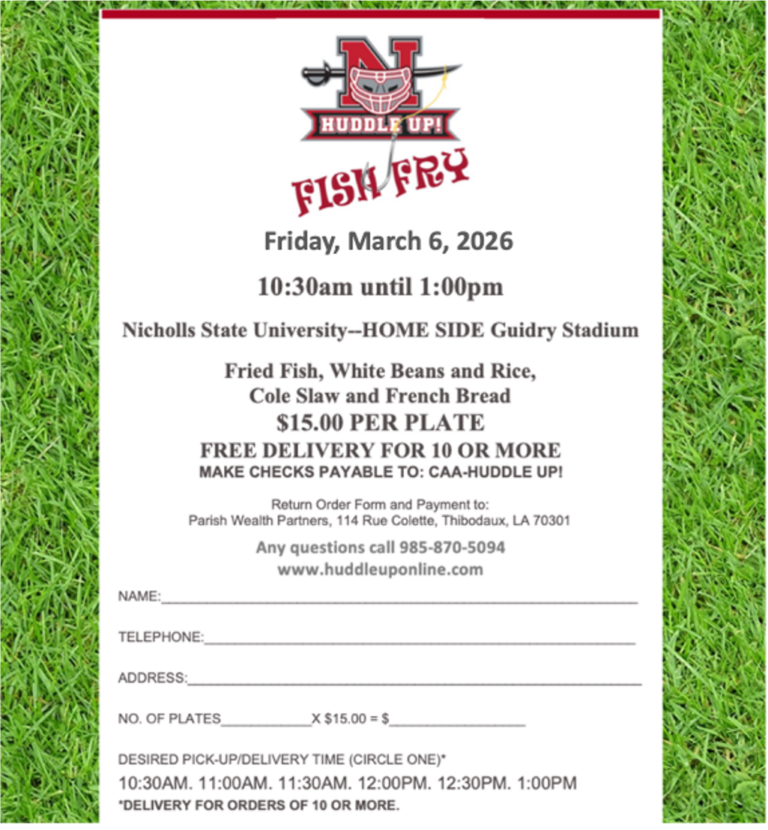 HUDDLE UP! operates under the purview of the Colonel Athletic Association, the principal fundraising organization for the Nicholls State University Department of Athletics. The Colonel Athletic Association is a subsidiary of the Nicholls Foundation, an independent 501(c)(3) Corporation. Your contributions are tax-deductible to the extent allowable by law. Please consult your tax adviser for more information.