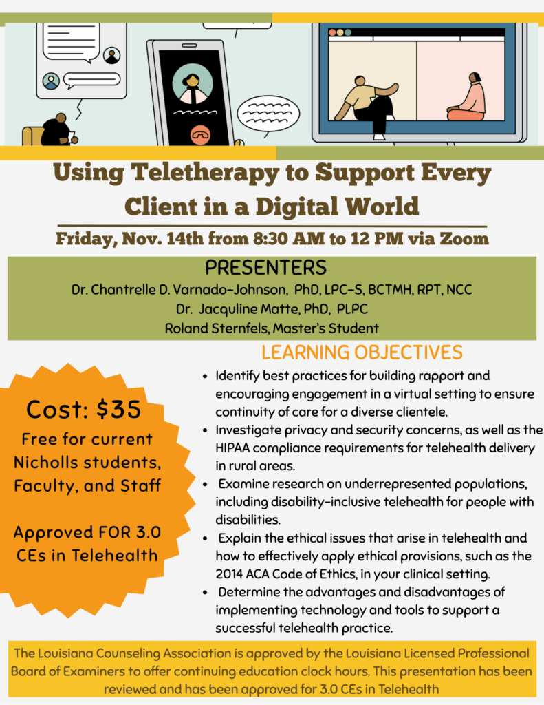 CEU Info: The Louisiana Counseling Association is approved by the Louisiana Licensed Professional Board of Examiners to offer continuing education clock hours.  These presentations have been reviewed and have been approved for 3.0  CEs clock hours in Telehealth.
