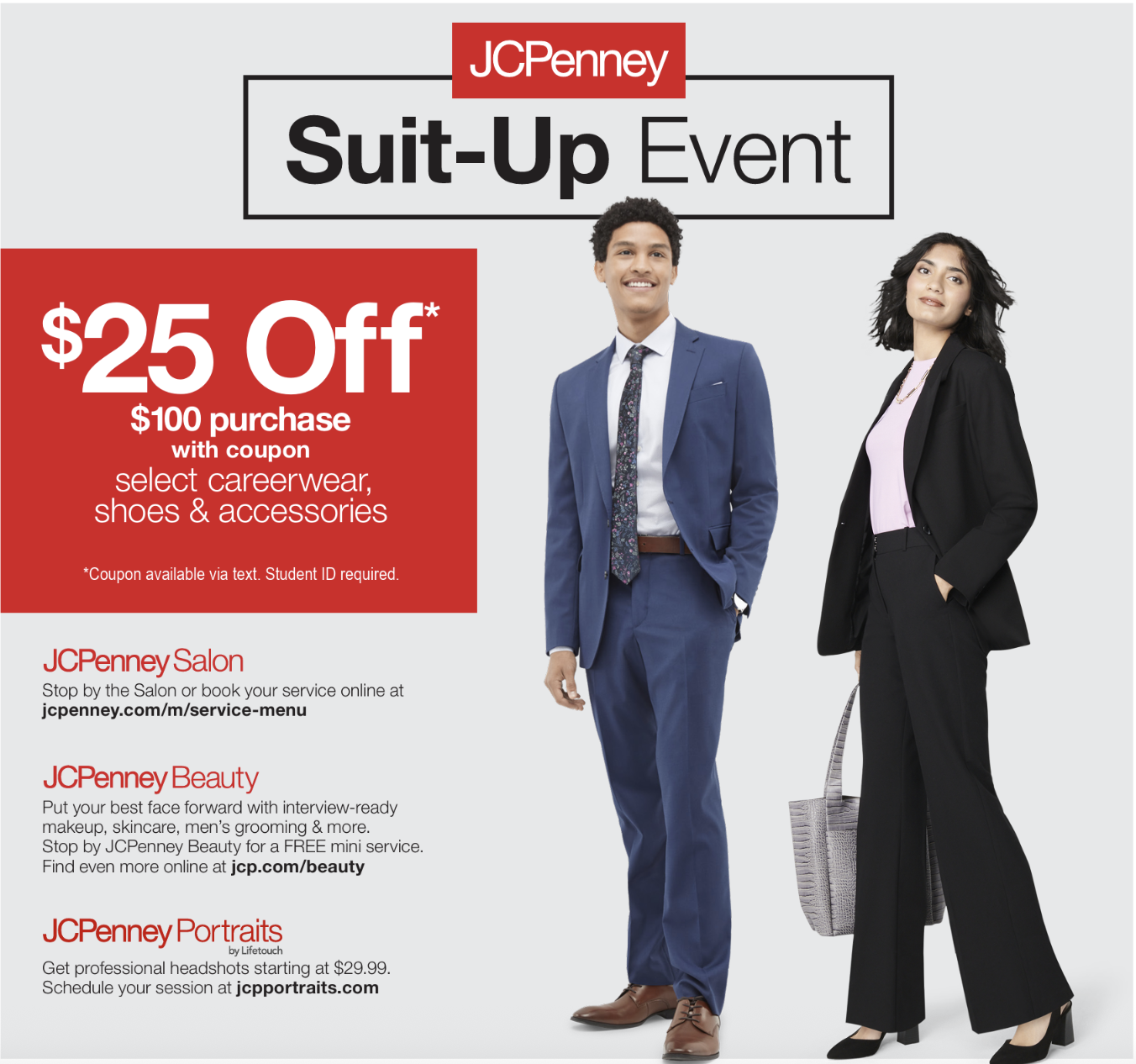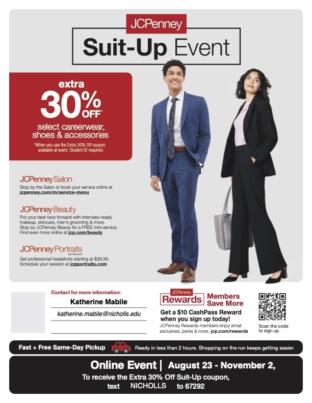Through a partnership with JCPenney, Nicholls State University students, staff, faculty, and alumni are invited to save on your in-person and online purchases of professional attire and accessories.