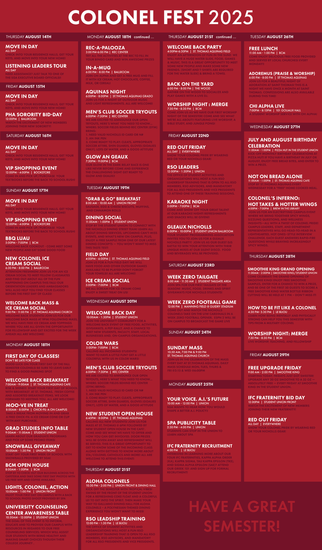 Whether you are new to campus or returning for another semester, Colonel Fest has an event for you! The schedule is full of FUN and FREE events to help you connect with old friends, meet new ones, explore your Nicholls State University home, and celebrate the start of a new chapter!