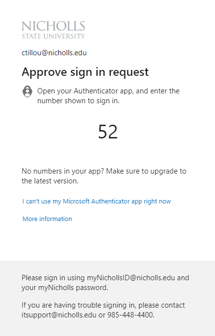 Multi-Factor Authentication adds an extra layer of security to your myNicholls sign-in and will eventually be required for all applications accessed through myNicholls. You will have two authentication options: the Microsoft Authenticator app or a phone option via call or text.