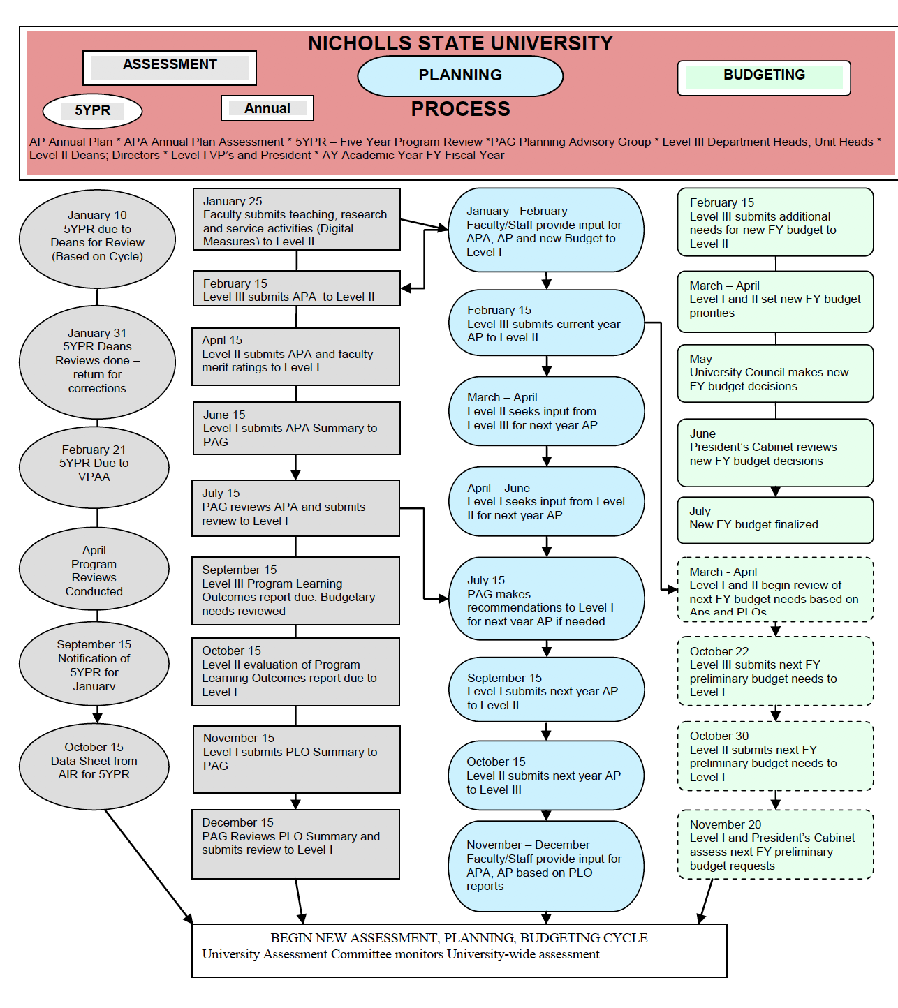 Nicholls State University has a comprehensive and integrated assessment, planning, and budgeting process in place. Through this process, expected outcomes are identified and assessed, and evidence of improvement is documented, and illustrated in the Assessment, Planning, and Budgeting flowchart. Numerous committees, as specified in the University Policy and Procedure Manual, are in place to govern and monitor this process, and responsibility for this process is shared by the Executive Vice President, the Vice President for Academic Affairs, the Executive Director of Planning and Institutional Effectiveness, and the Director of Assessment and Institutional Research. The Director of Assessment and Institutional Research reports directly to the Executive Director of Planning and Institutional Effectiveness, who is responsible for strategic planning and assessment. The Executive Vice President reports directly to the President and serves on the Planning Advisory Group, University Assessment Committee, President’s Cabinet, Executive Budget Committee, and the Budget Committee. The Executive Director of Planning and Institutional Effectiveness is responsible for assisting in the development and maintenance of Strategic and Annual Planning processes and serves on the Planning Advisory Group and University Assessment Committee and reports jointly to the Executive Vice President and the Vice President of Academic Affairs.