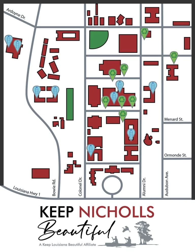Keep Nicholls Beautiful manages recycle bin and water bottle refill stations across campus for everyone to use.