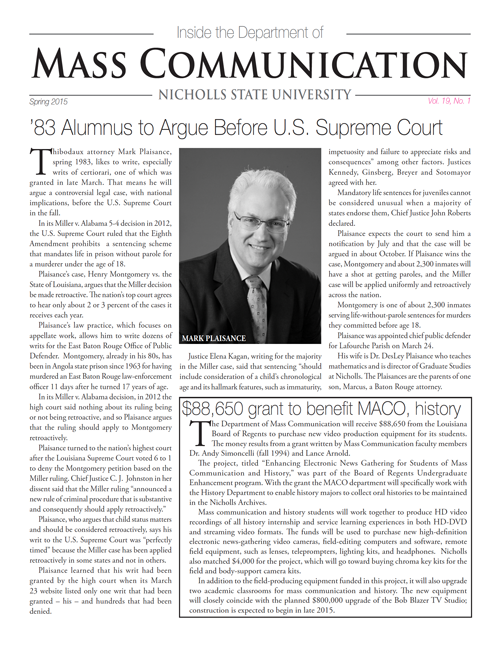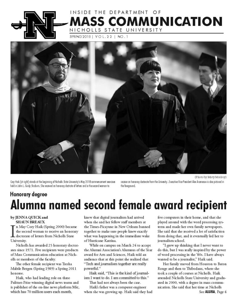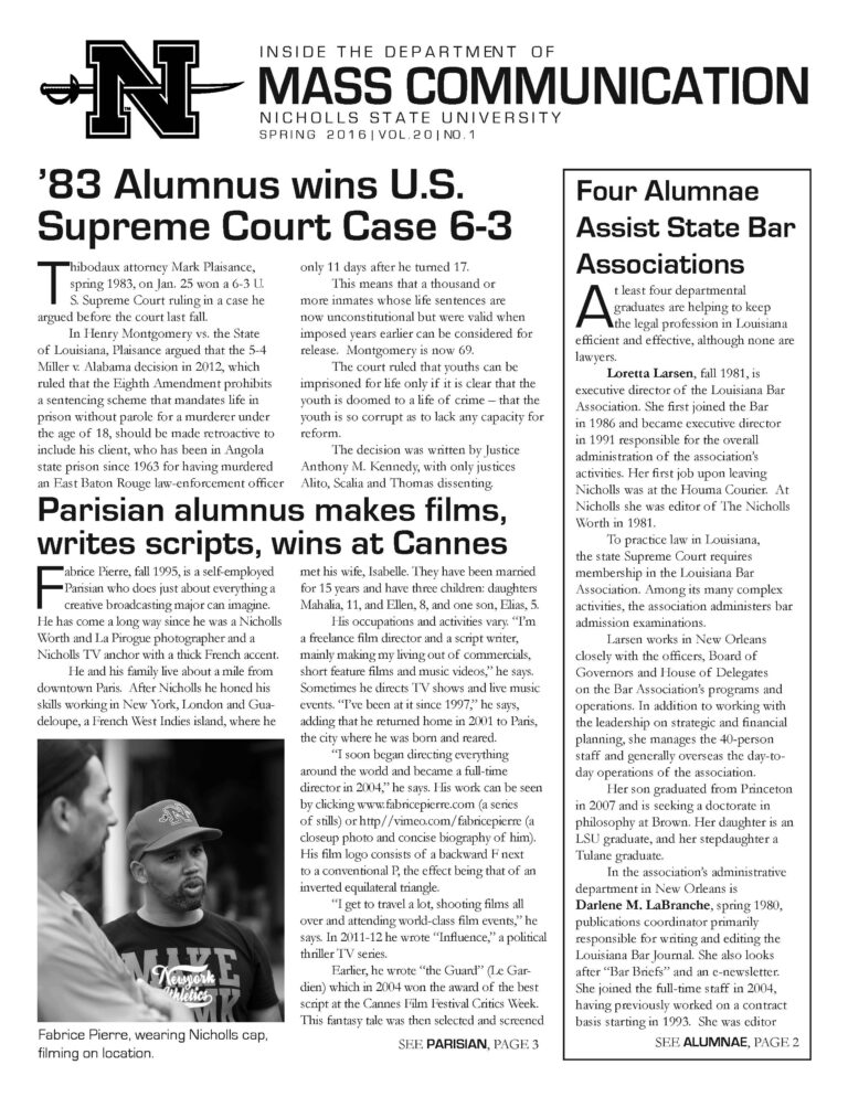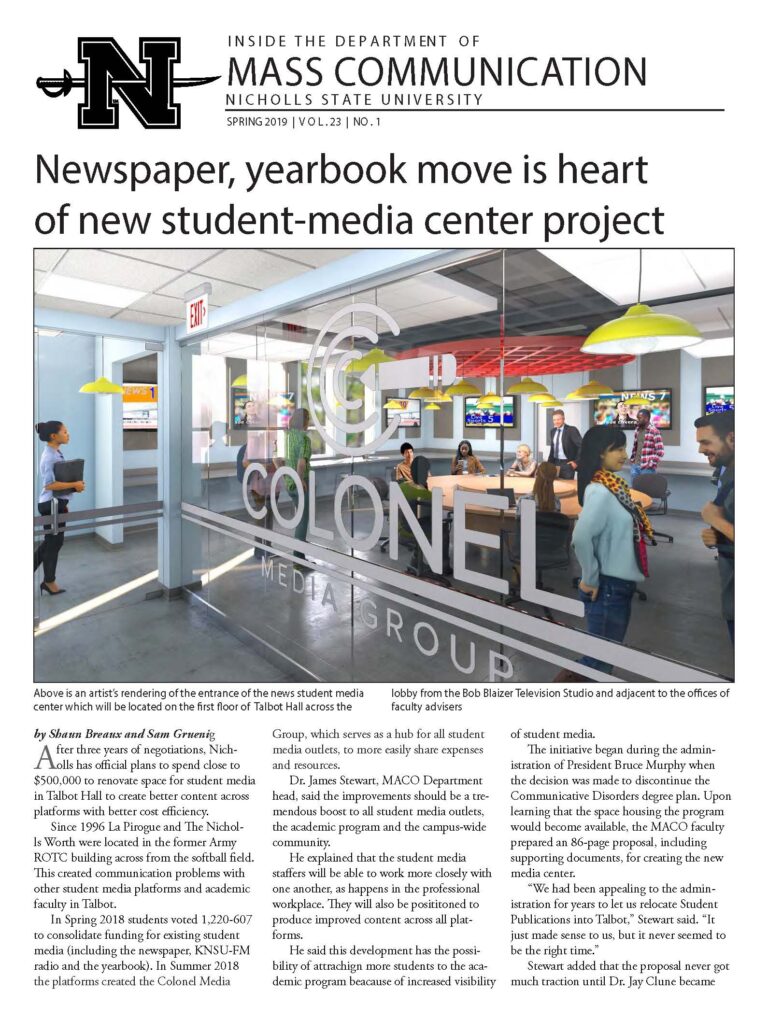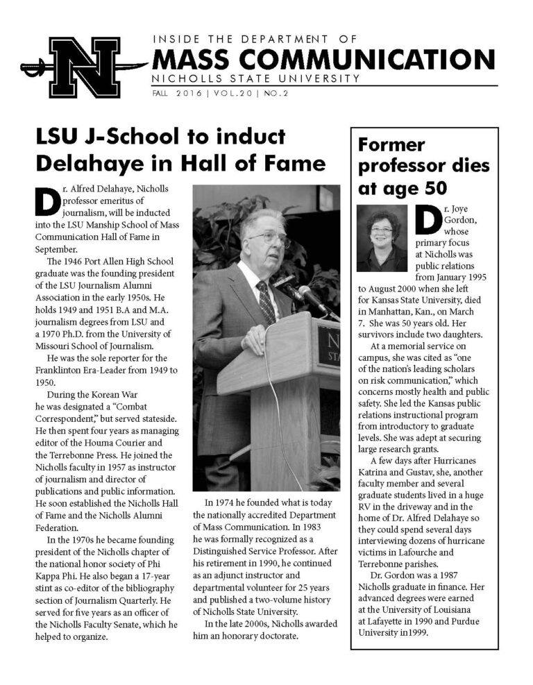 MACO Newsletter Home Academics Internships Speech Student Handbook Current Students Job Opportunities Publications Garde Voir Ci Chez Nous The Nicholls Worth Department Newsletter Global Institute Faculty & Staff Dr. Al Delahaye Faculty Resources 🔒 Alumni Job Opportunities Newsletter Home Academics Internships Speech Student Handbook Current Students Job Opportunities Publications Garde Voir Ci Chez Nous The Nicholls Worth Department Newsletter Global Institute Faculty & Staff Dr. Al Delahaye Faculty Resources 🔒 Alumni Job Opportunities Newsletter A publication by the Department of Mass Communication. Fall 2024Fall 2023Spring 2021Spring 2019Spring 2018Fall 2017Fall 2016Spring 2016Spring 2015 CONTACT INFORMATION Department of Mass Communication (MACO) Office Location 102 Talbot Hall Mailing Address PO Box 2031, Thibodaux, LA 70310 Phone 985.448.4586 fax: 985.448.4577 Email Dr. James Stewart, Head CAMPUS LOCATION
