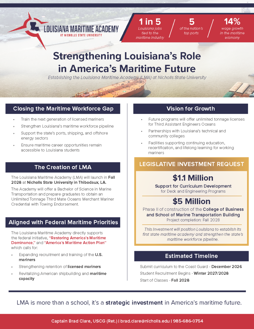 By leveraging Louisiana’s unique geography, maritime heritage, and industrial base, LMA will prepare the next generation of licensed mariners while supporting national workforce priorities and strengthening the country’s maritime capability.