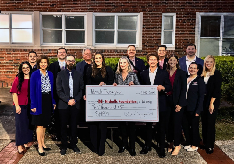 THIBODAUX, La. – Nicholls Society of Human Resource Management received a $10,000 contribution from Pamela Trepagnier in support of the organization’s growing enrollment and competition ...