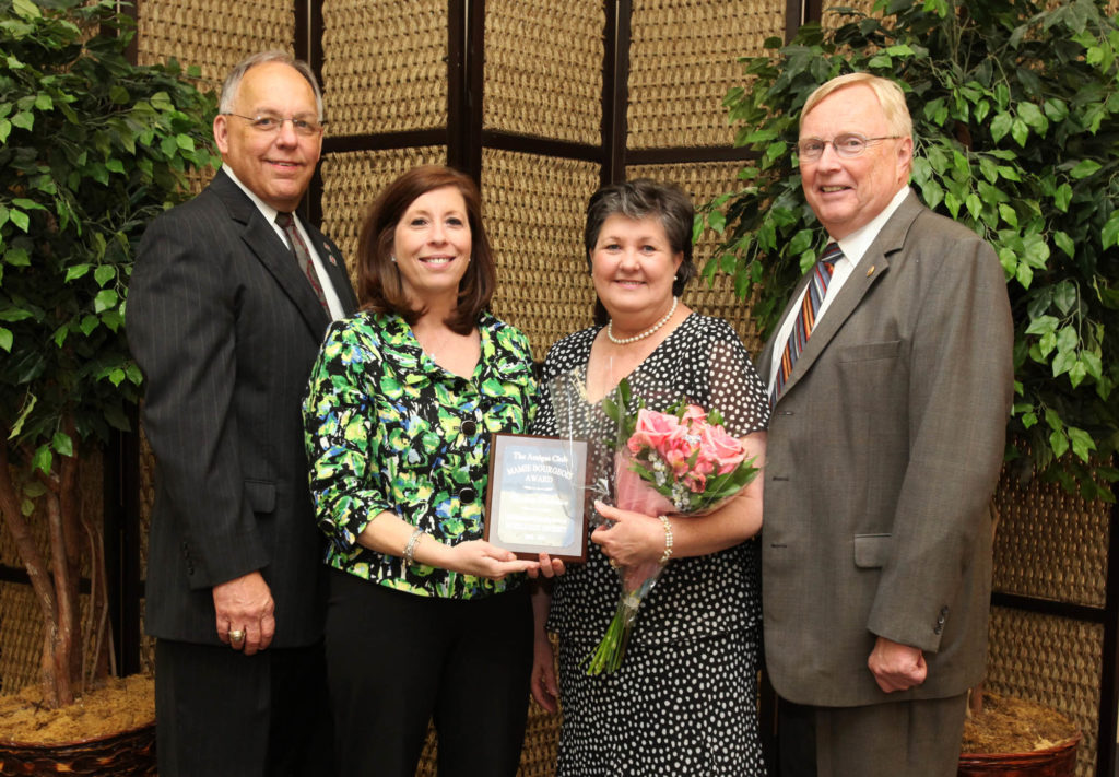 Pictured from left are Larry Howell, executive vice president; Mamie Bourgeois Memorial Service Award presenter Karen Raynal; Robertson; and Dr. Stephen T. Hulbert, university president.