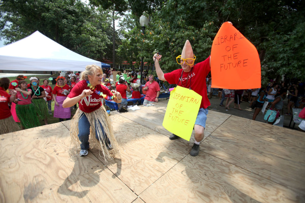 Danny Gorr, library associate, and Rebecca Naquin, nursing instructor, competed in a “dance off” during “Welcome Back Day” activities in the Nicholls State University Quadrangle on Thursday, Aug. 25. Naquin was declared the winner by the cheering crowd. Held annually at the beginning of the fall semester, “Welcome Back Day” features music, food and information booths for new and returning students.Lee Daigle, admissions counselor, emceed from the stage.DoBee Plaisance, head women’s basketball coach, delivered a motivational, school-spirit-centered message.