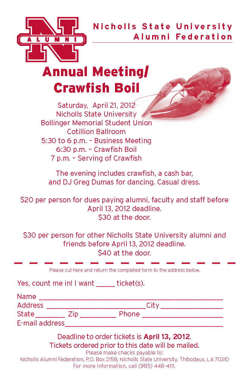 THIBODAUX – The Nicholls State University Alumni Federation Annual Meeting and Crawfish Boil is slated for Saturday, April 21, in the Cotillion Ballroom of the Bollinger Memorial Student Union.