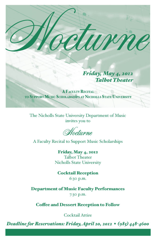 THIBODAUX – The faculty of the Nicholls State University Department of Music will present the sixth annual Nocturne – a recital in support of music scholarships – on Friday, May 4, in the Mary M. Danos Theater (formerly Talbot Theater) on the university campus.