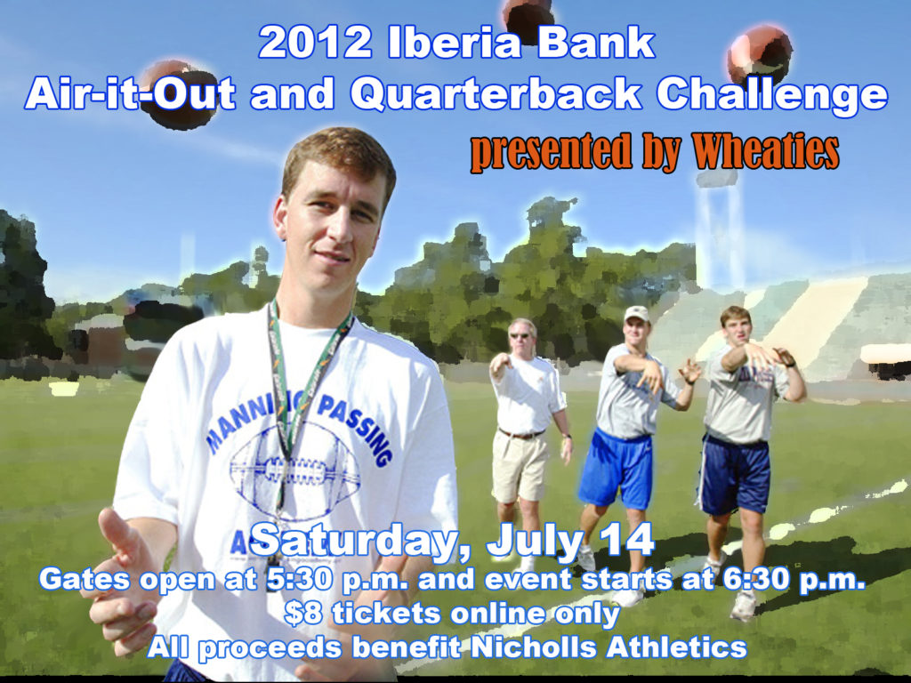 The “Air it Out and Quarterback Challenge,” sponsored by Iberia Bank and Wheaties, will begin at 6:30 p.m. in John L. Guidry Stadium as part of the annual Manning Passing Academy, scheduled for Thursday, July 12, to Sunday, July 15, at Nicholls.