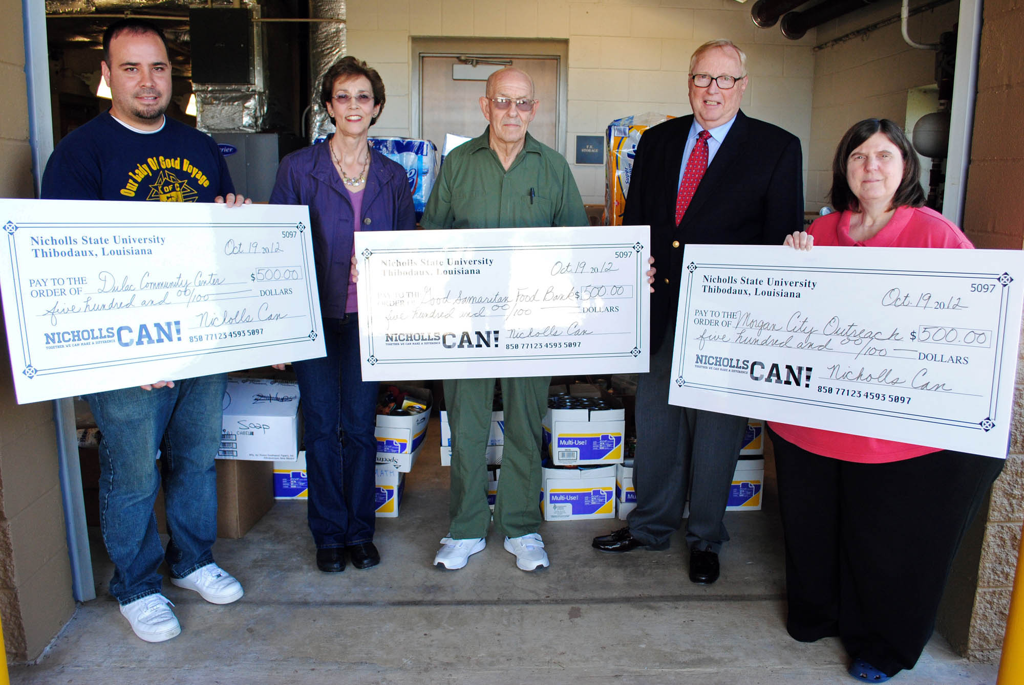 Pictured, from left, are John Silver, executive director of the Dulac Community Center; Jean Donegan, head of the Nicholls Department of Art and Nicholls CAN! committee member; Reynold Pitre, manager of Houma’s Good Samaritan Food Bank; Dr. Stephen T. Hulbert, Nicholls president; and Kay Raymond, executive director of St. Mary Outreach Inc.