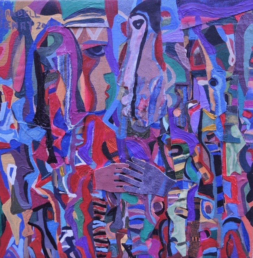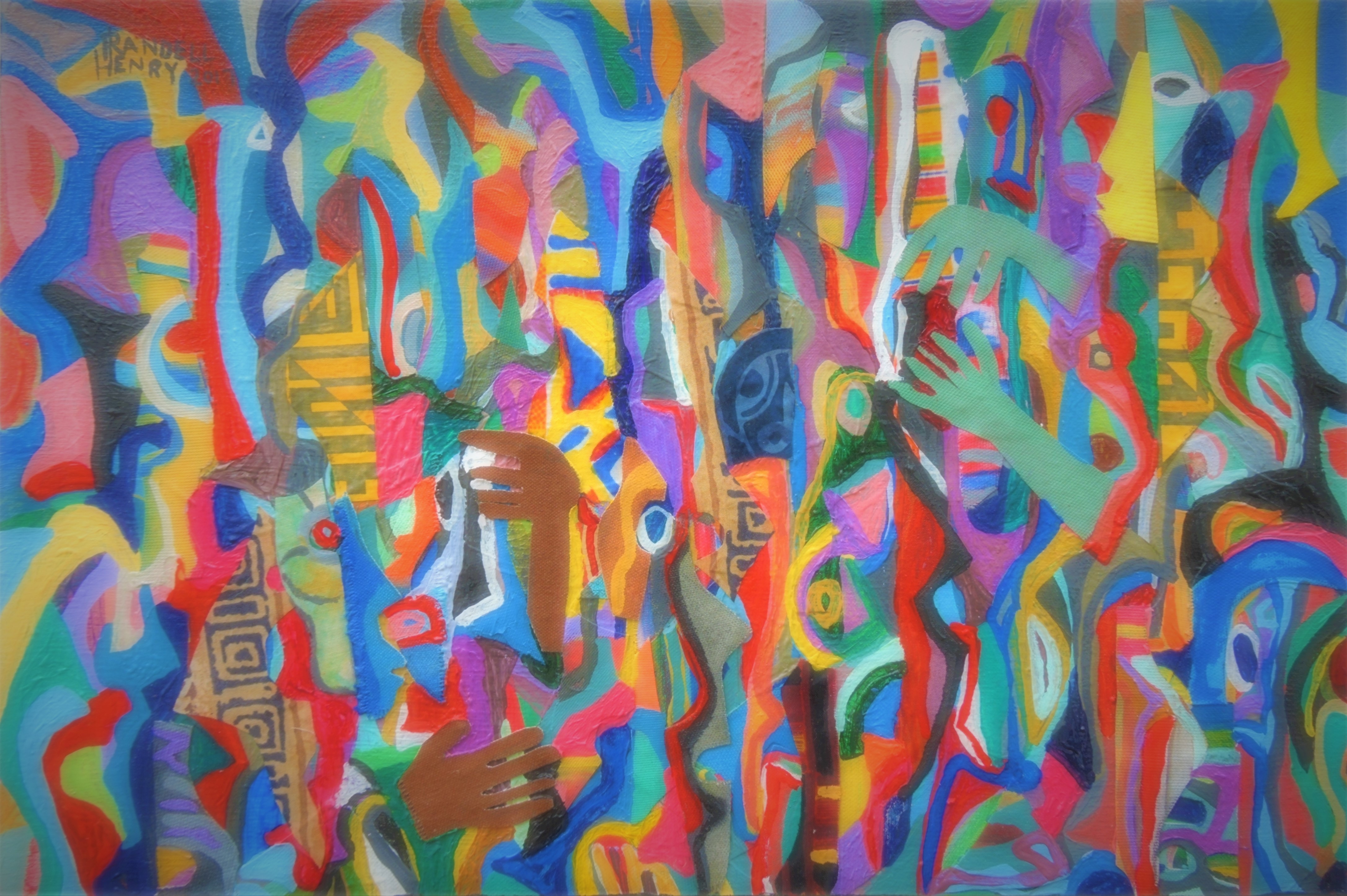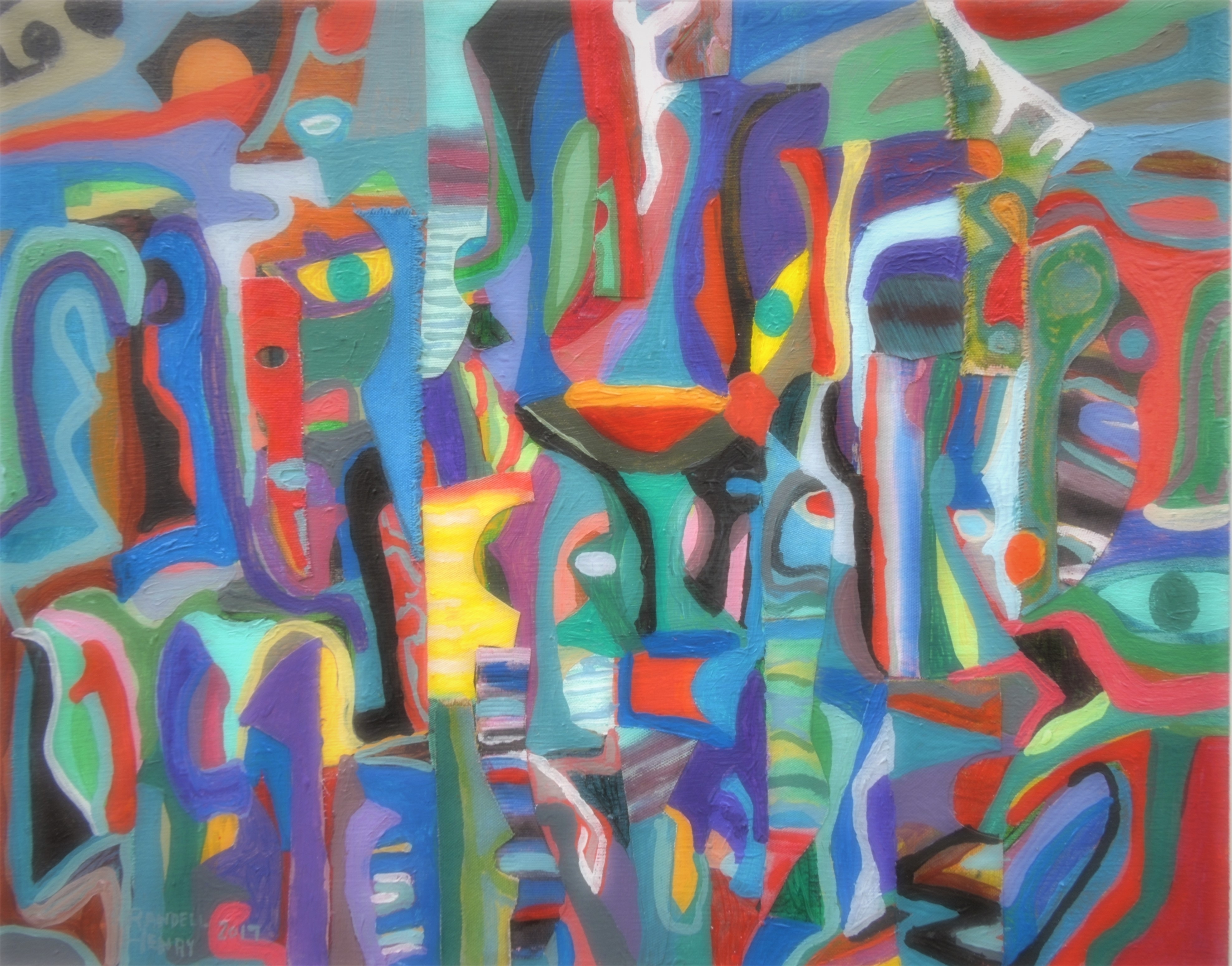 Henry began making collages in 1980 by cutting and tearing his drawings and putting the pieces together in inventive ways. Henry relies on paint, graphic media and his own painted papers, fabric and imagination to make collages that have played on themes related to family life, couples, blues and jazz music and mythological subjects.