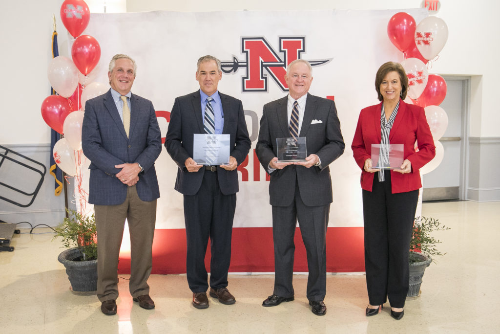 President of the Nicholls Foundation Board Chris Riviere (BS ‘78) received the James Lynn Powell Award, South Louisiana Bank the Corporate Mark of Honor and Dean of the College of Business Administration Dr. Marilyn Macik-Frey the Honorary Alumni Award.