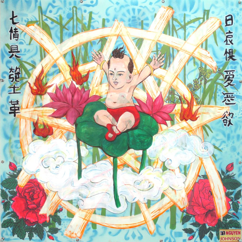 Titled “The Lotus Boy,” the painting focuses on a southeast Asian depiction of Sudhana from Buddhist folklore perched on a lotus leaf. Duyen looked to a televised depiction of the classic Chinese novel “Journey to the West” which she watched as a child growing up for inspiration.