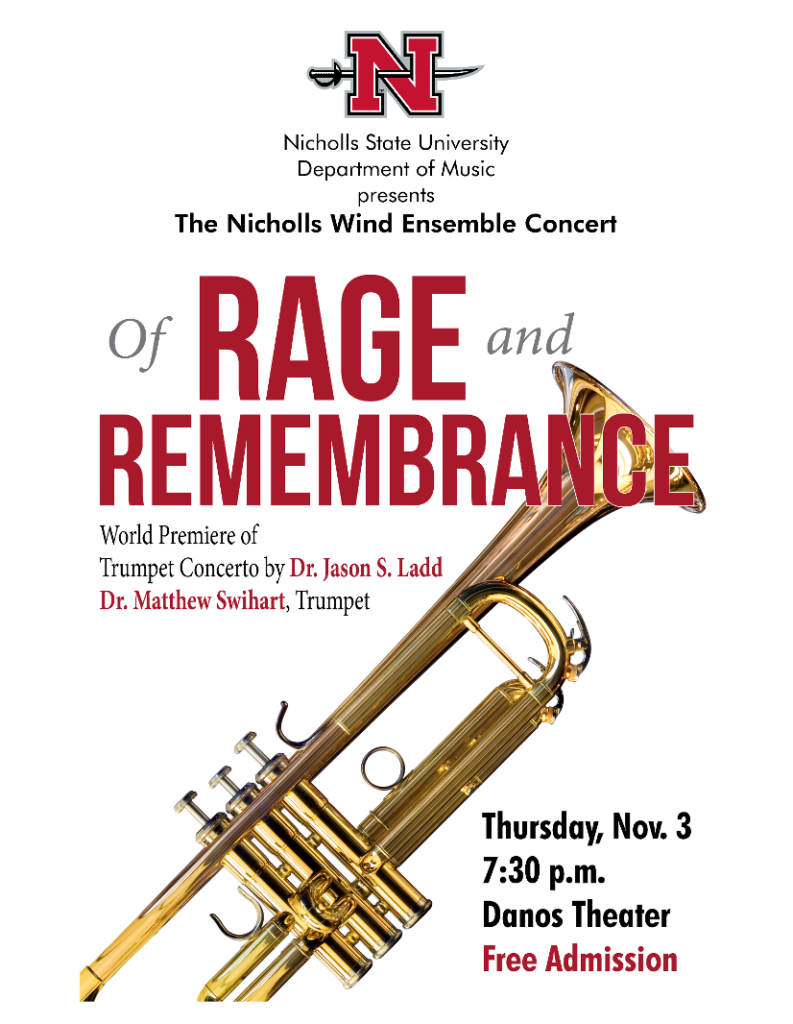 THIBODAUX, La. — Nicholls Wind Ensemble is set to host a free concert titled “Of Rage and Remembrance” on Thursday, Nov. 3, 2022, in Danos Theater at 7:30 p.m. The concert will be led by Dr. Jason S. Ladd, and his Trumpet Concerto will be premiered by Nicholls trumpet professor Dr. Matthew Swihart.