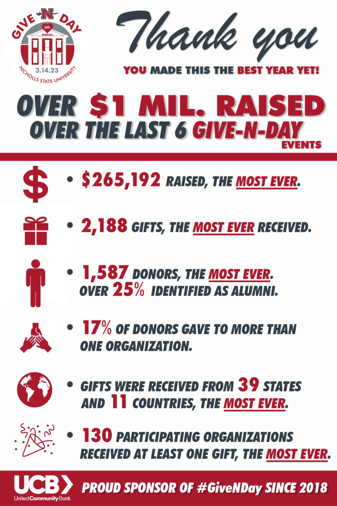 THIBODAUX, La. – After its sixth Give-N-Day, The Nicholls Foundation has raised over $1 million for the University’s departments and student organizations. Nicholls’ 2023 Give-N-Day received the most donors, donations and funds raised ever, raising over $265,000 with 1,587 donors and 2,188 donations.