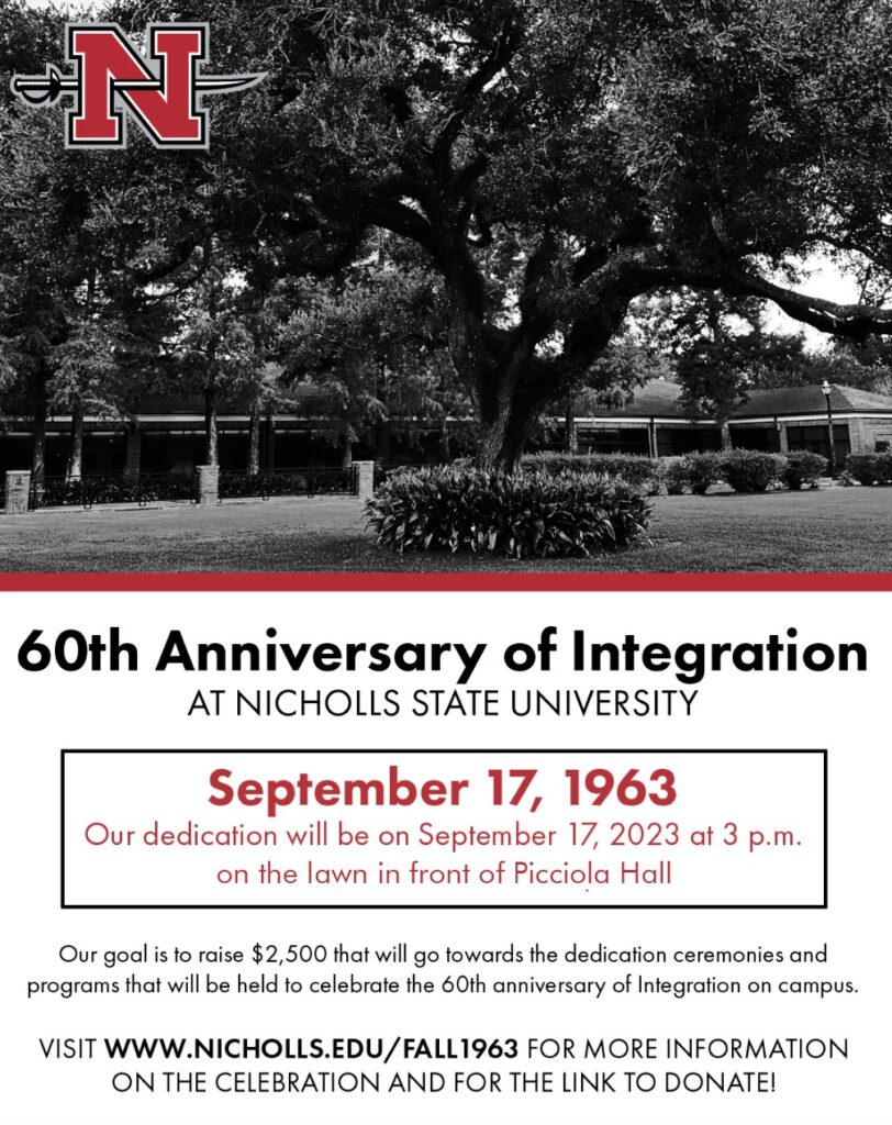 THIBODAUX, La. – Nicholls is set to host a dedication ceremony on Sunday, Sept. 17, 2023, to commemorate its 60th anniversary of integration. The event is set to take place at 3 p.m. on the front lawn of Picciola Hall.