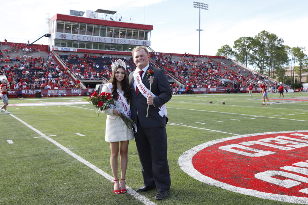 THIBODAUX, La. – Junior Katie Louviere, a nursing major from Cut Off, and senior Andrew Gilmer, a communicative disorders major from Lockport, were crowned the Nicholls 2023 Homecoming Queen and King during the homecoming football game halftime on Saturday, Oct. 7, 2023. The Colonels defeated the Houston Christian University Huskies 38-7. The full homecoming court was introduced at a halftime presentation, and royalty candidates completed the traditional walk across Manning Field.