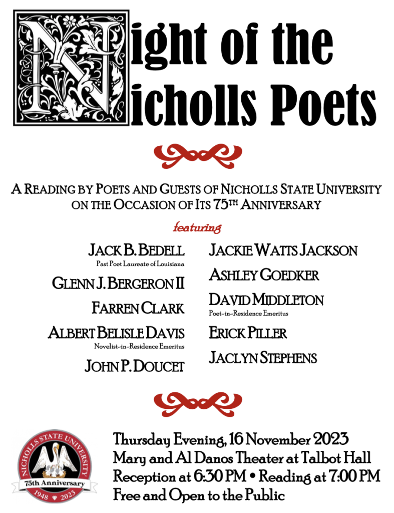 Nicholls first Night of Poets event was held in November during the 70th anniversary year. Nicholls Night of Poets II will be celebrated in conjunction with Nicholls’ slate of 75th-anniversary events planned for the 2023-2024 academic year. To learn more, visit www.nicholls.edu/calendar/. For more information on the event, please contact john.doucet@nicholls.edu.
