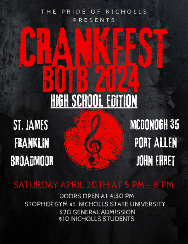 THIBODAUX, La. – The Pride of Nicholls is set to host its Battle of the Bands: High School Edition on Saturday, April 20 at Stopher Gymnasium from 5 p.m. to 8 p.m. with doors opening at 4:30 p.m. General admission to the event is $20 and Nicholls student tickets are $10.
