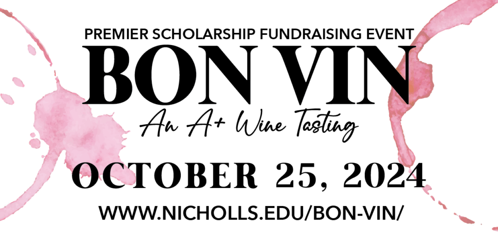 THIBODAUX, La. – Nicholls State University’s scholarship fundraising event Bon Vin: An A+ Wine Tasting is set to take place on Friday, Oct. 25 from 6 to 9 p.m. at the Danos Corporate Headquarters, the event’s host sponsor, with catering to be provided by the Chef John Folse Culinary Institute. Dr. Jody Plaisance, owner and operator of Cuvée, will serve as the event sommelier. All proceeds will assist Nicholls students, many of whom rely on scholarship funds to attend the university.