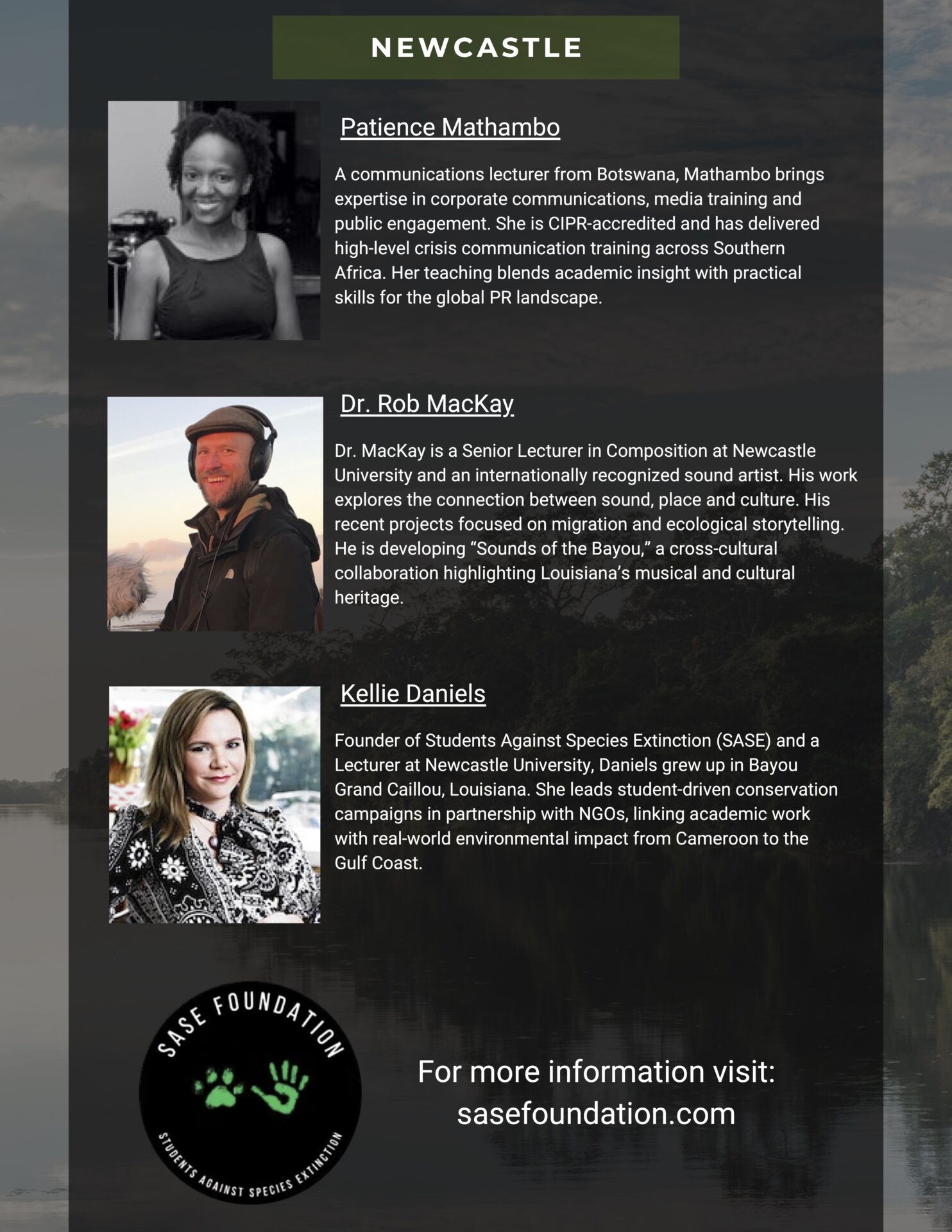 - Kellie Daniels – Founder of Students Against Species Extinction, Lecturer, Newcastle University, United Kingdom
