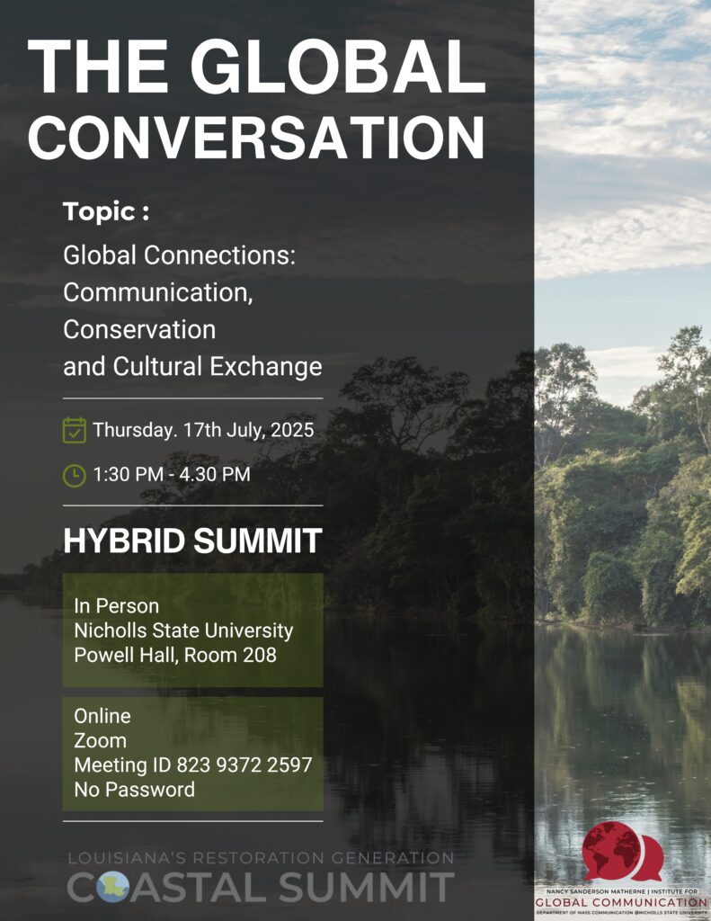 THIBODAUX, La. – Nicholls State University is set to host The Global Conversation, an international summit focused on environmental concerns. This free, hybrid event is open to the community and will be livestreamed by the United Nations and available to attend via Zoom or in person on Nicholls’ campus in Powell Hall Room 208 on July 17 from 1:30 to 4:30 p.m.