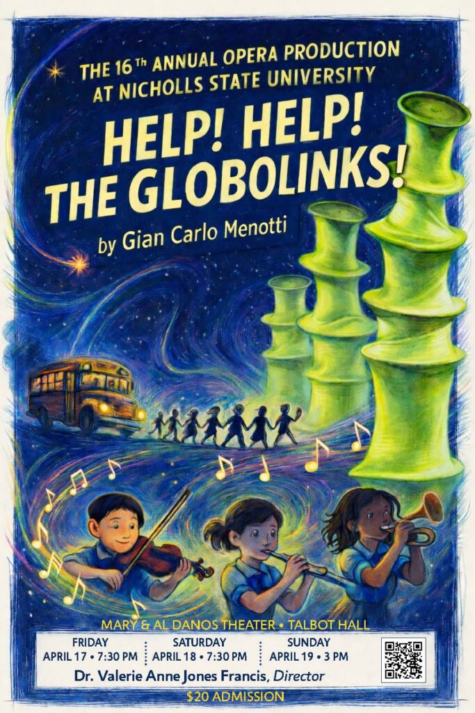 THIBODAUX, La. – Nicholls State University is set to host its annual opera production of Help! Help! The Globolinks! by Gian Carlo Menotti. In this performance, extraterrestrials invade Earth to steal away music, but will the power of music prevail?